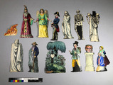 - Delar av scenografi kopplat till ett teaterverk. Figurer i papp med tryckt motiv. Bakgrund i glas med limmad dekor på. Många motiv på figurer kopplade till död, skelett, trolleri etc. Scengolvet är lådan samt med tillhörande kulisser som ingår.
