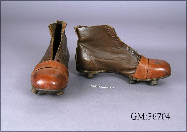 Ett par fotbollsskor av brunt läder, tvåfärgade med tån och ett band över främre delen i ljusare brun färg. Snörhål (snören saknas). Lädersula med sex runda läderdubbar. Märkta inuti SH, utanpå Arsenal. Gott skick. (:1= vänster sko, :2= höger sko) Använda av fotbollsspelare i IFK Göteborg. märket "Arsenal" med 6 st dubbar under varje sko. Har använts av spelare i IFK Göteborg.