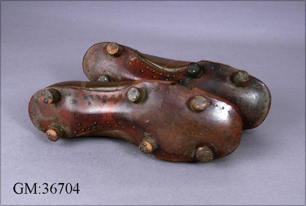 Ett par fotbollsskor av brunt läder, tvåfärgade med tån och ett band över främre delen i ljusare brun färg. Snörhål (snören saknas). Lädersula med sex runda läderdubbar. Märkta inuti SH, utanpå Arsenal. Gott skick. (:1= vänster sko, :2= höger sko) Använda av fotbollsspelare i IFK Göteborg. märket "Arsenal" med 6 st dubbar under varje sko. Har använts av spelare i IFK Göteborg.