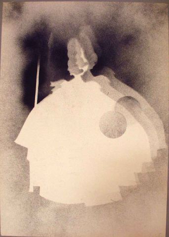 - Skissen utförd i sprutmålning med reservering och visar en kvinna stående med ansiktet i profil mot mörkgrå bakgrund och med med flera skuggade konturer. Hon har högt uppsatt hår iklädd stor vid hellång kostym. (Se även GTM:3195-3197)