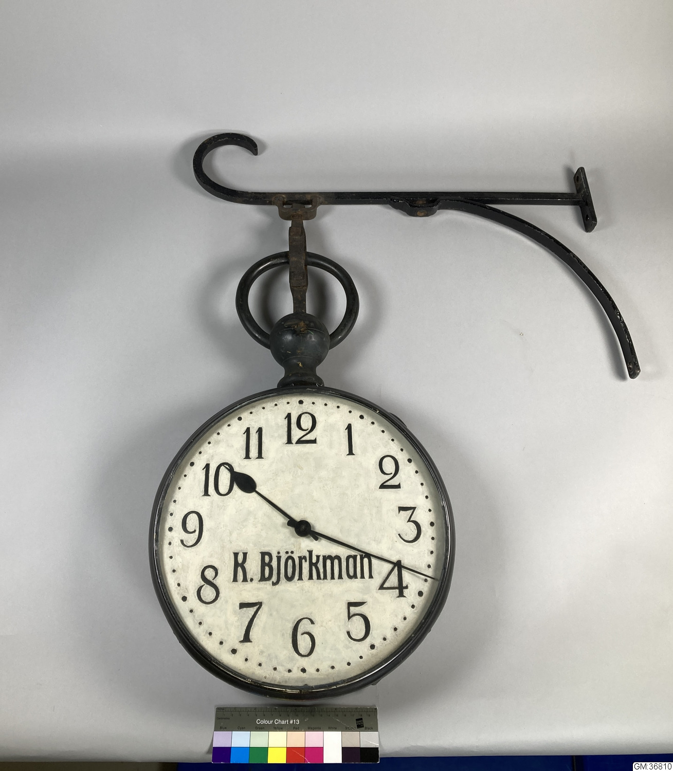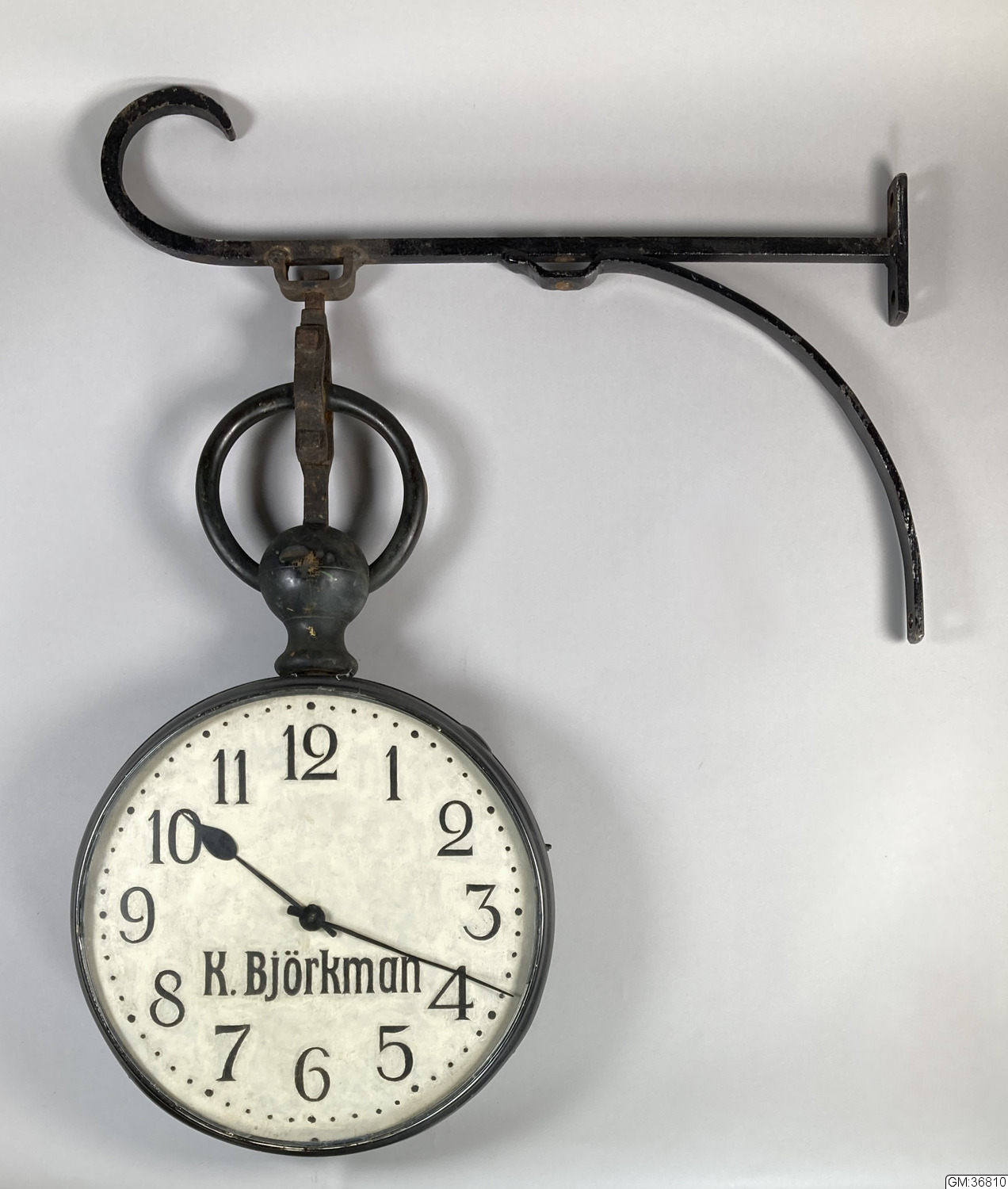 - Urmakeriskylt med stativ av svartmålat järn i form av en stång som ett liggande J med hållare för rund svart klocka med vit urtavla, svarta arabiska siffror och visare samt texten: K. Björkman .#Väggfästets mått L: 69, B:40, H:3 cm.#