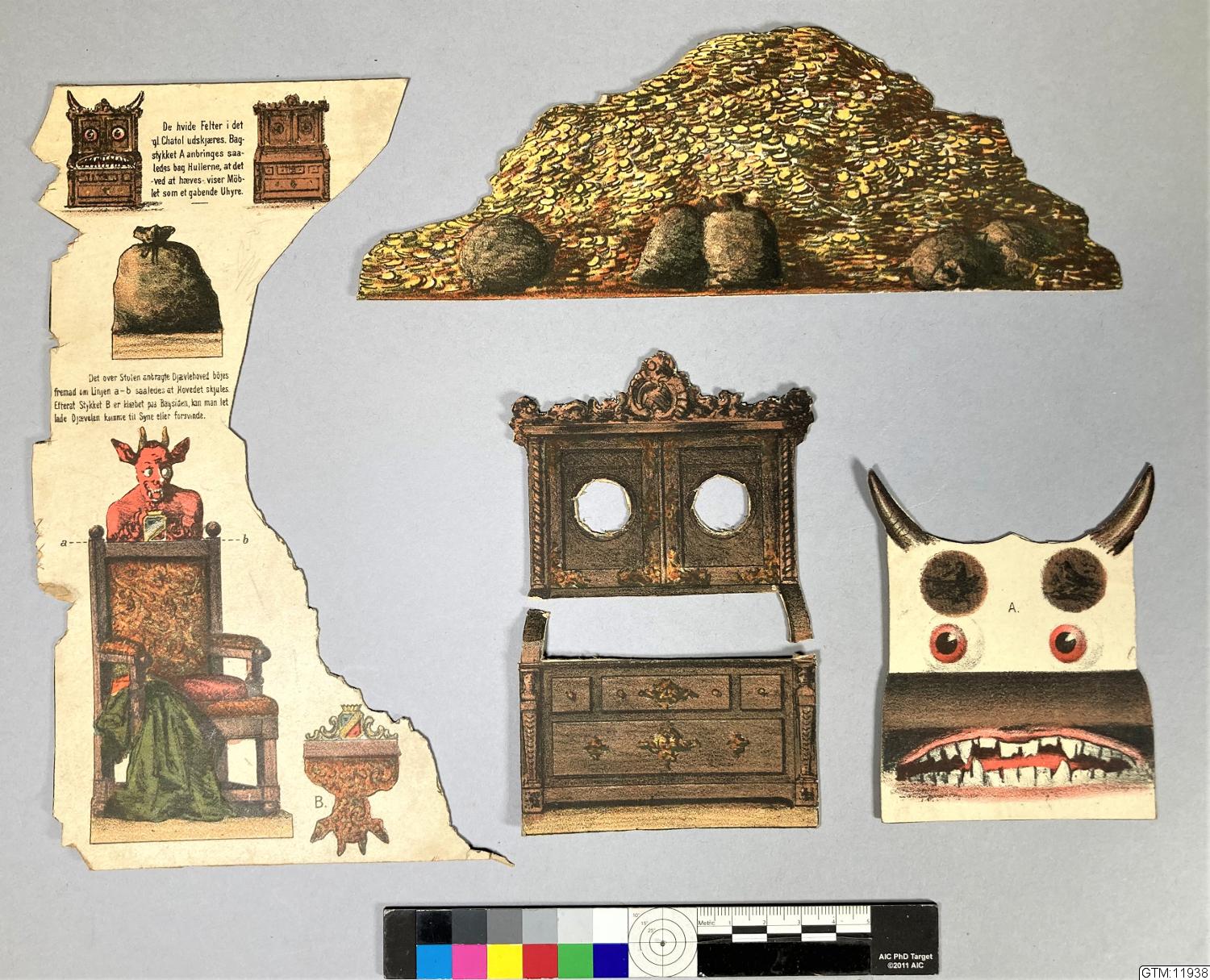 kulisser utskurna i kartong. ett monster, en byrå, ett klippark med diverse figurer samt en hög med guldpengar.