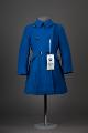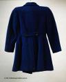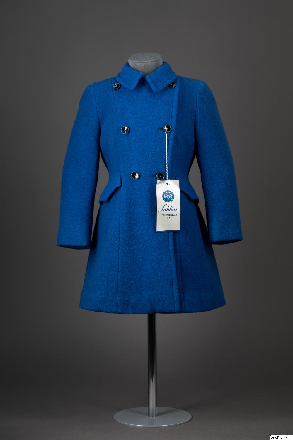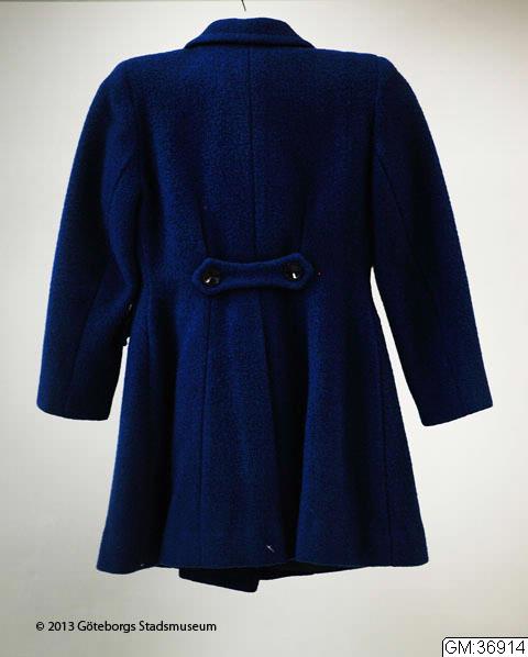 - Flickkappa av kornblått ylletyg, insvängd modell, inskurna fickor med lock, sex svarta knappar, liten krage, sleif baktill med två knappar. Blått konstsilkefoder. Etikett: "Sahlins Konfektions AB, Eslöv. Pris 69:-"