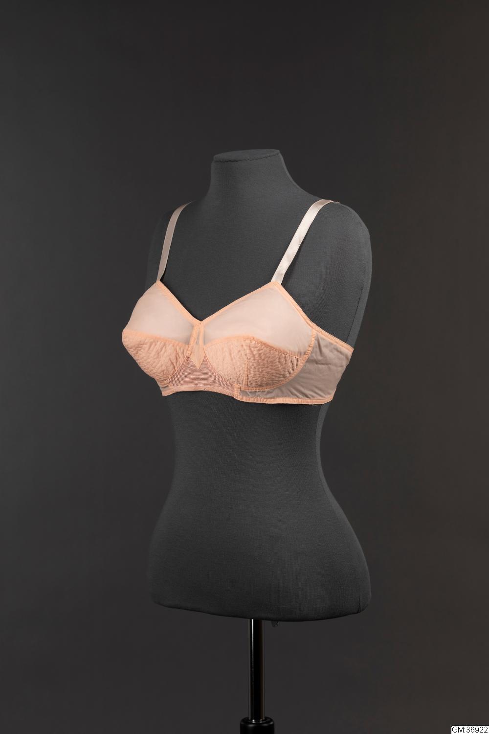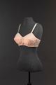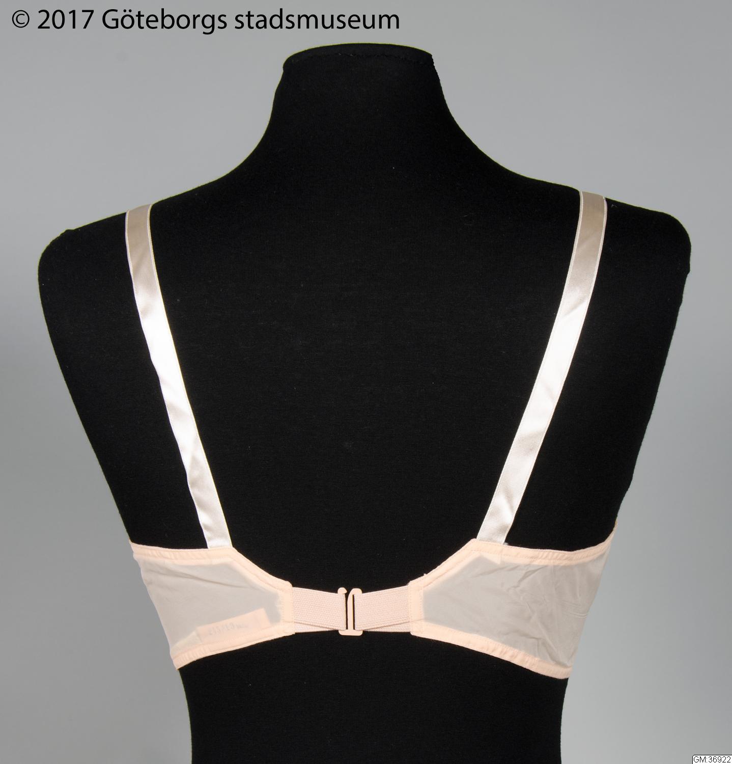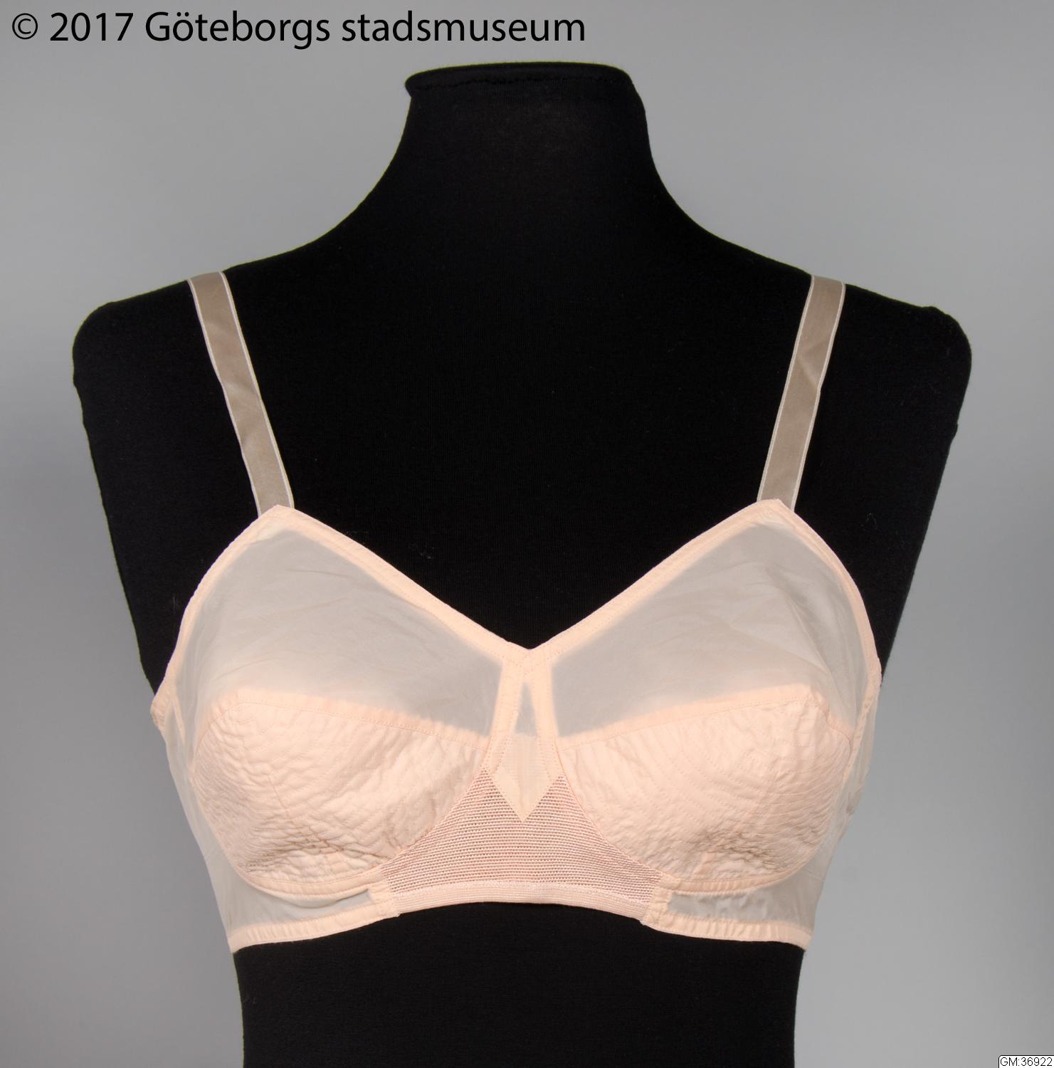 - Behå, figursydd av rosa nylon med kuporna försedda med stickningar. Resår mitt fram. Axelband med resår mitt bak. Etikett: Hasselblads, Nylon Perlon. Micht bögeln [bör möjligen vara “Nicht bögeln” får ej strykas på tyska]. Inköpt för 10 :-