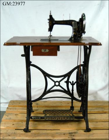 Det första patentet på en fungerande symaskin togs 1830 i Frankrike, men oroliga skräddare slog sönder maskinerna och uppfinnaren tvingades fly. I stället var det i USA på 1850-talet som symaskinen för hemmabruk slog igenom. Snart exporterades den till Europa och kopierades. Museets maskin är av märket Nornan, från Nornans symaskin AB som låg i Göteborg, i hörnet Östra Hamngatan /Drottninggatan .