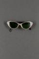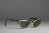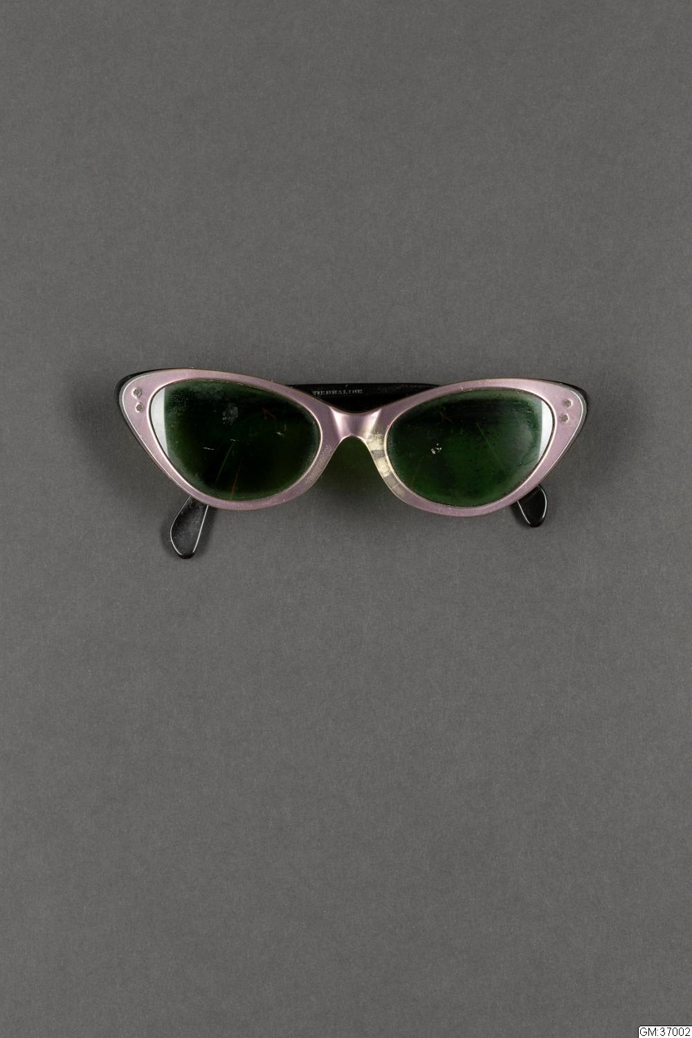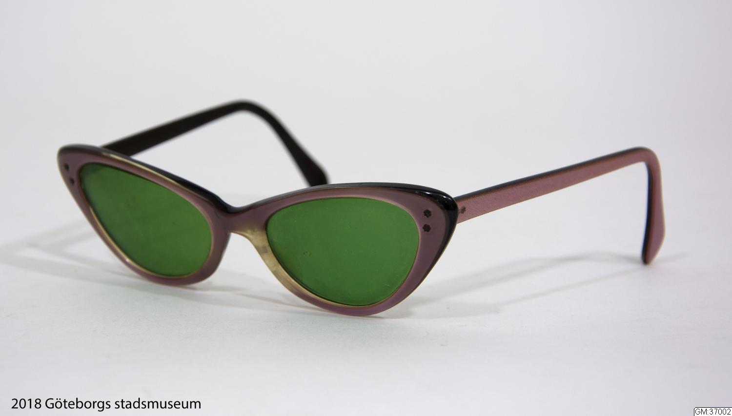 1950: s woman’s sunglasses, frames of plastic in violet on the outside and black on the inside. Green glass lenses. Marked Viennaline.