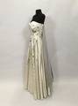 Axelbandslös aftonklänning i cremefärgat siden med broderade paljetter. Dragkedja i sidan. Tillhörande överkjol i grå tyll.