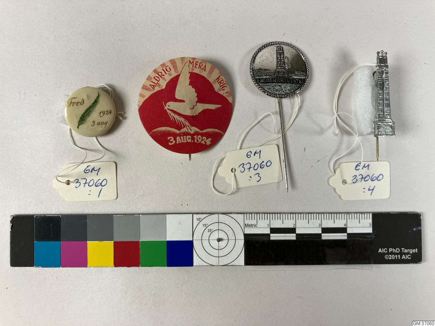 fyra olika märken knutna till olika aspekter av fredsrörelsen.