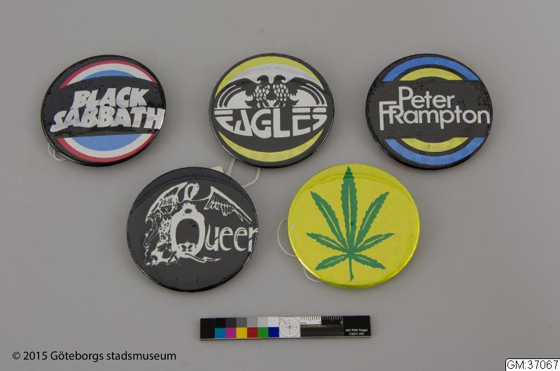 - Fem pins, rockmärken i metall och plast med tryck efter rockband och musiker.