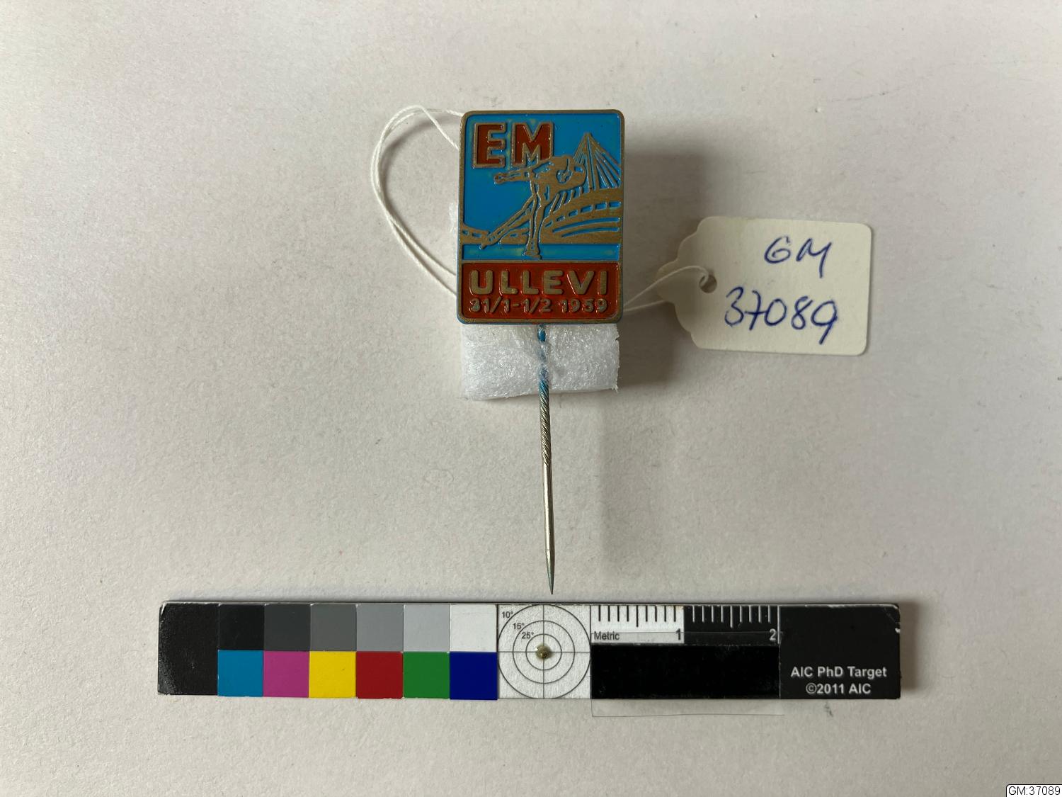 - Rocknål med fyrkantigt huvud "Svenska skridsko-förbundet " "EM Ullevi 31/1-1/2 1959" motivet visar en hastighetsåkare på skridskor.
