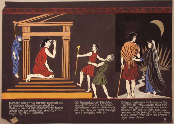- Skissen utförd på svart papper med en röd bård upptill och text nederst. Scenbilden utgörs av t v, gulbruna trappsteg upp till en avsats med kolonn på var sida, ytterst t v på den hänger från taket en blåklädd kvinnofigur, uppe på avsatsen mellan de två kolonnerna ligger en mörklockig man på knä iklädd vinröd tunika, i mitten av skissen är två mansfigurer på väg upp för trapporna, den ene iklädd vinröd tunika, den andre grön, på höger sida vandrar en man och en kvinna i väg på en grå slingrig väg mot en uppgående sol och en månskära överst, han iklädd vinröd tunika med orangefärgad draperad kåpa, hon i hellång blå klänning med gråsvart mantel.