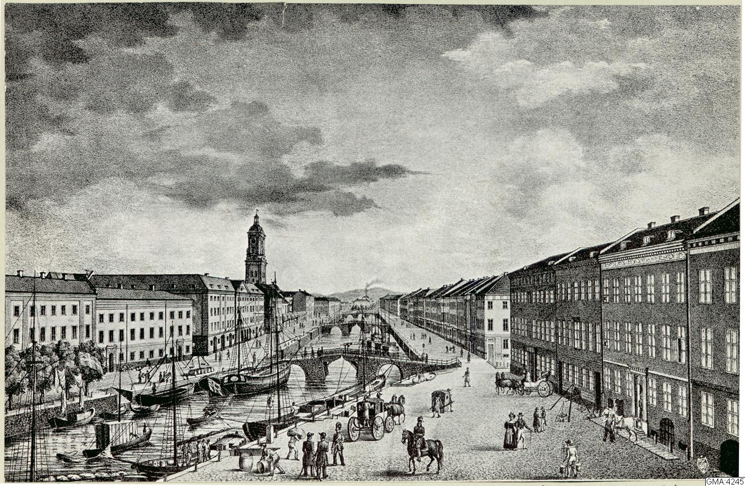 Stora Hamnkanalen med närmaste grannskap mot öster. Autotypi efter litografi av Adolf Hårdh. Efter teckning av Leonard Björkfeldt.