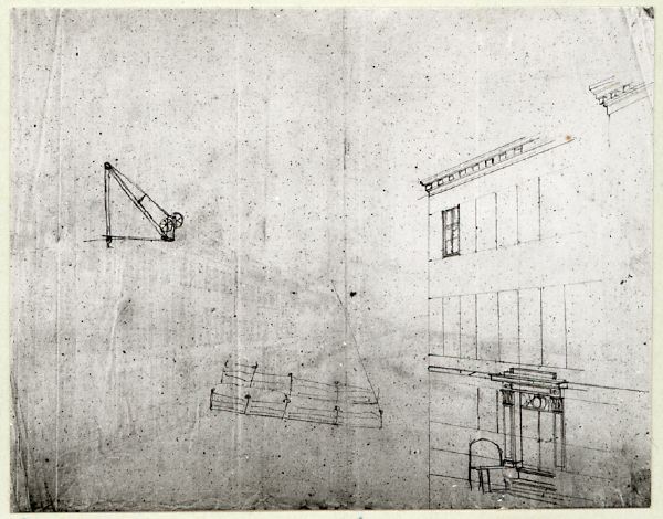 Blyertsteckning av Johan Leonard Björkfeldt. En av fastigheterna i Lilla Torg-räckan? Detaljstudier.