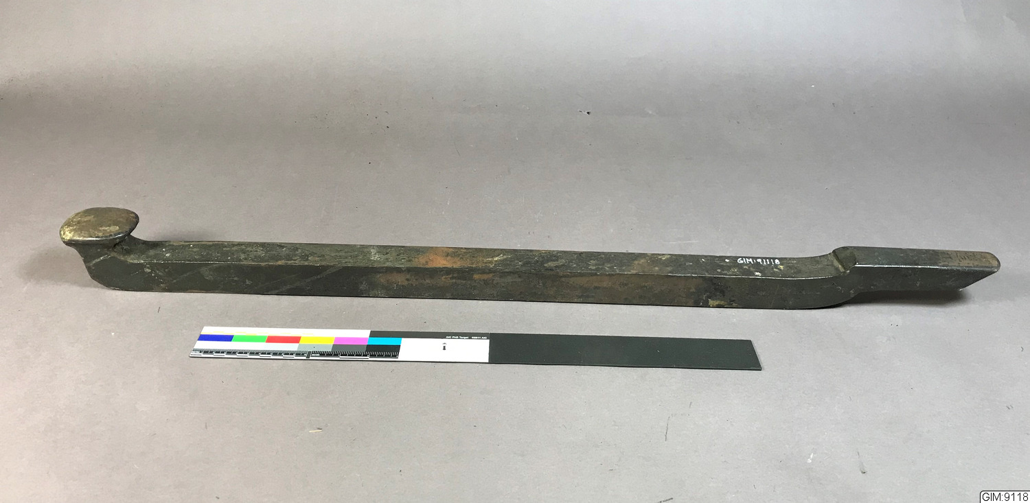 Kan ha använts tillsammans med GIM:9116 - kubbe. Passar in i skåran."Faff är ett verktyg i metall som används bland annat inom smides- och metallhantverk. Den har formen av en stång där ett metallstycke är fäst vid ena änden, som sedan är avrundad eller kantig beroende på tillämpningen. Verktyget används bland annat till att driva plåt vilken innebär att man kan forma plåten genom att anlägga plåten mot faffens blanka yta och sedan hamra på det så att den formas efter faffen (exempelvis med en drivhammare). Ytan ute vid faffens ände är vanligtvis blankpolerad eftersom märken och repor i faffen annars kommer att slås in i den plåt som formas. Faffen är anpassad för att kunna spännas fast i ett skruvstäd, arbetsbänk eller att kilas in i en stock, då den kan utsättas för rätt stora krafter vid arbetets gång." Från Wikipedia