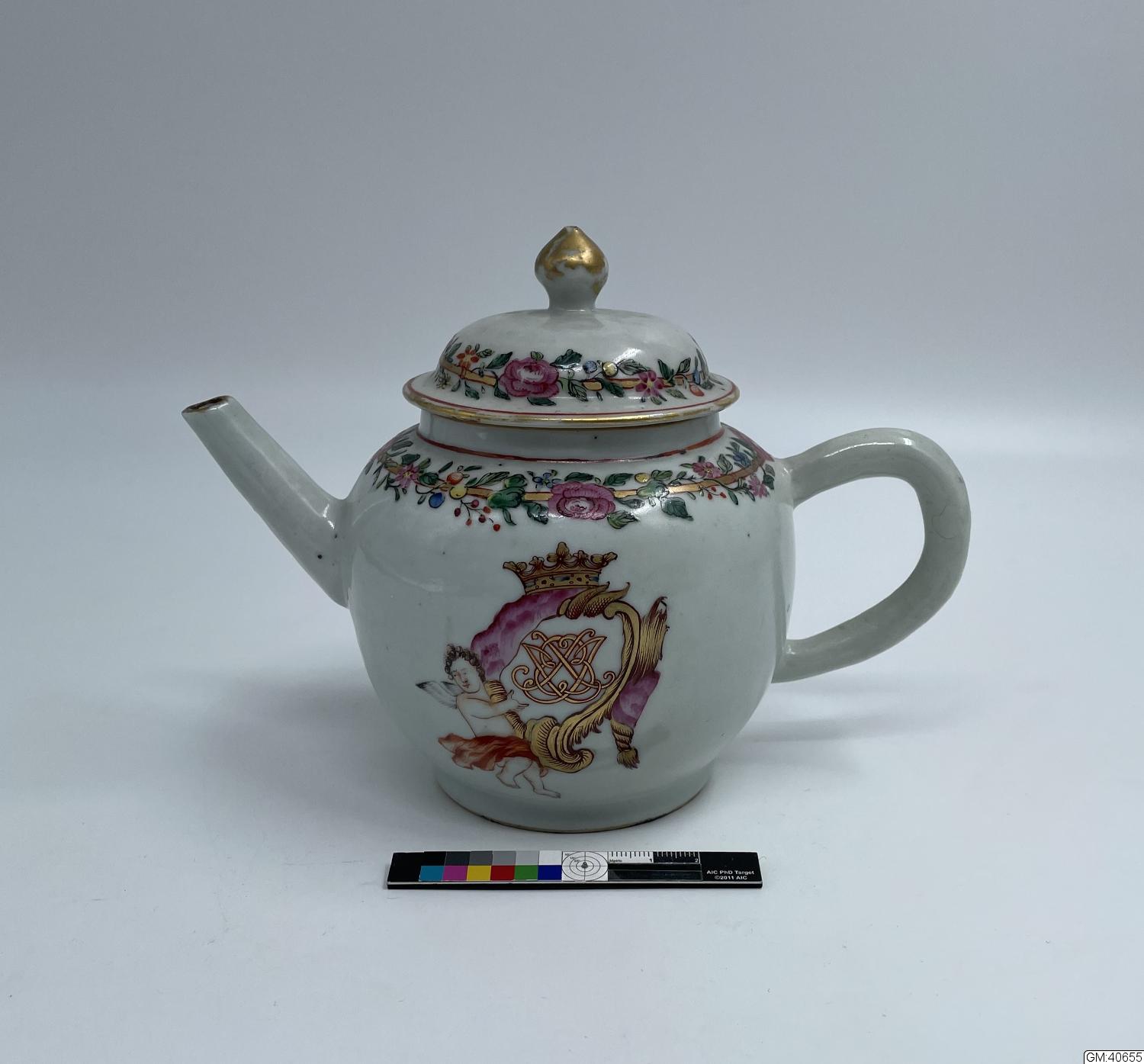 bukig med välvt lock; mjukt rundad lodgrepe, högt placerad kort pip, lökformad lockknopp. Gråvitt gods med krönt, rokokokartusch med monogram, i guld med rödviolett dapering allt buret av ängel med kopparrött höftskynke, på båda sidor. Runt skuldran och lockets kant bredare resp. smalare blomstergirland i flera färger runt bambustav i guld. Förgylld lockknopp.