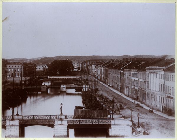 foto av foto i Göteborgs Stadsbibliotek. (Baeckström: Studier i Göteborgs byggnadshistoria före 1814, utökad uppl., illustration intill s. 9; m. text: "Stadsbild från Lilla Torget mot öster, foto. J. P. Peterson 1869. T.v. om Brunnsparkens lummiga trädgrupp skymtar det norra kvarnhuset. T.h. å bilden en tyvärr alltför starkt förkortad profil av Södra Hamngatskvarteren, varöver nya brandgavlar allt högre resa sig.--")