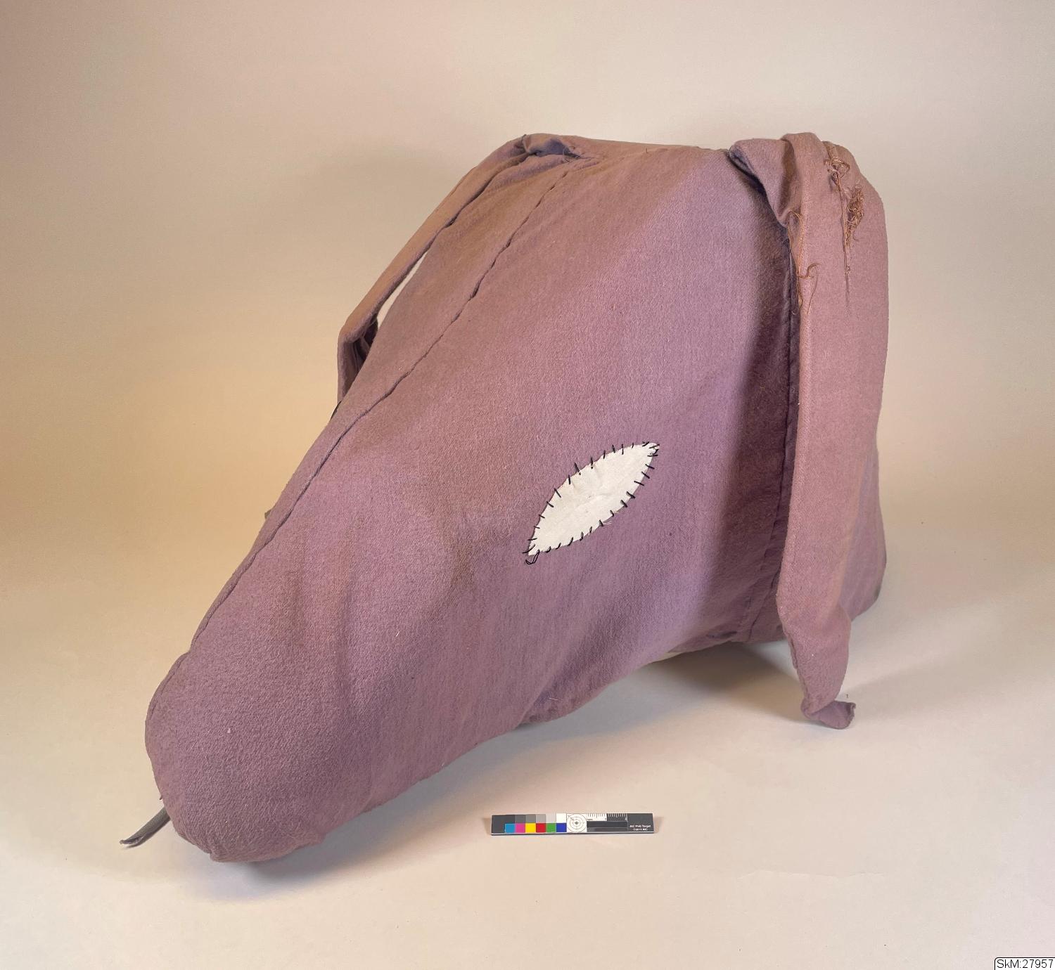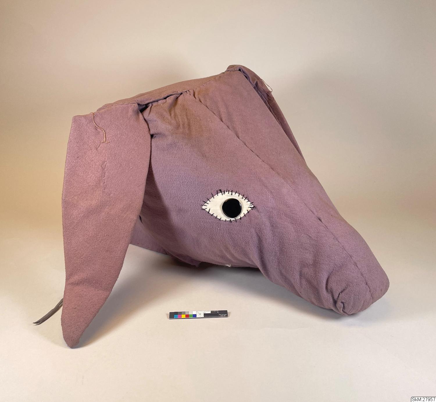 Åsnehuvud av papp och textil. Ihåligt för att kunna sätta på sitt eget huvud.