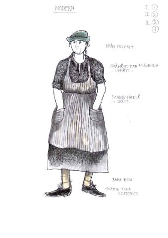 - En rundnätt kvinna med en grön hatt nedtryckt i pannan, iklädd gråmönstrad halvlång klänning md krage och uppkavlade ärmar, har händerna i fickorna på ett grårandigt förkläde, ljusbruna ben, svarta snörskor.