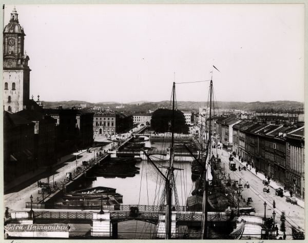 Stora Hamnkanalen samt Norra (t.v.) och Södra (t.h.) Hamngatorna sedda mot öster från Wijkska huset (S. Hamng. 7).