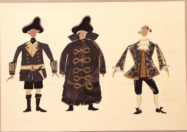 Till vänster man med ljus peruk, iklädd svart trekantig hatt med grått kantband, grå uniformsrock med beig uppslag och randiga ärmuppslag, ljust bälte med pistol, svart halskrås, svarta byxor, höga svarta kragstövlar. I mitten iklädd samma kost. med en ankellång mörkgrå rock (päls) med stor krage och guldgaloner (?) över.