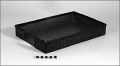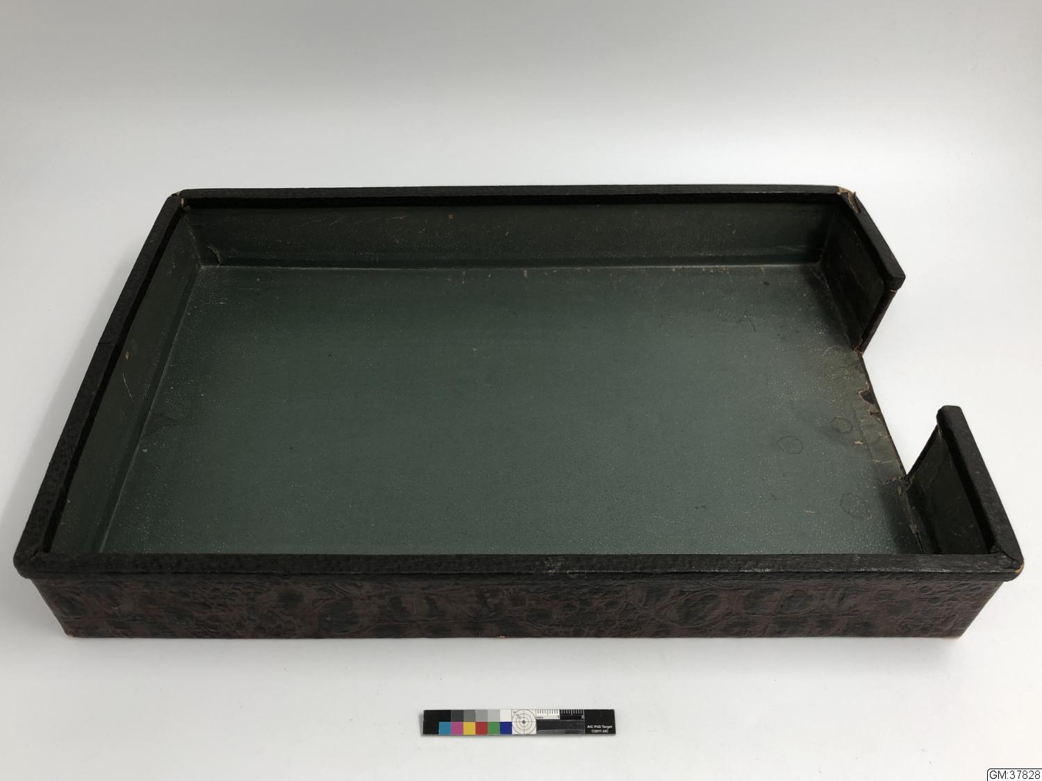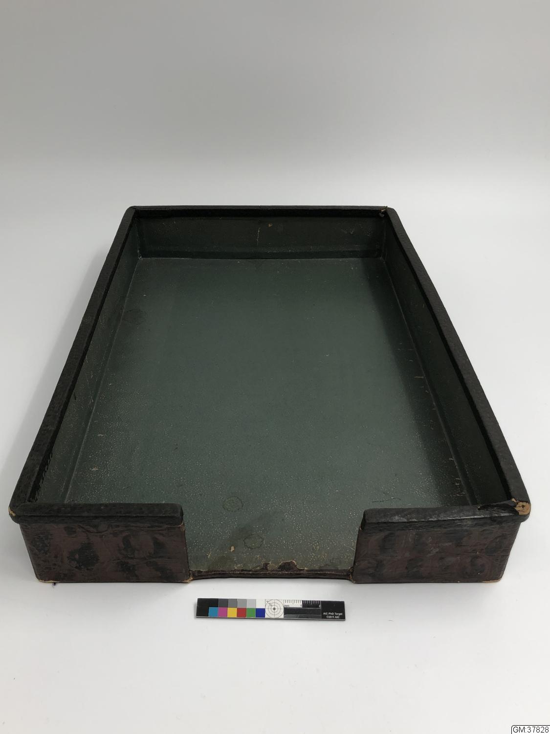 Rektanulär låda av pressat pappmaterial klädd med papper. Invändigt grönaktigt, utvändigt brun- och svartflammigt, pressat i skinnimitation. Undersidan svart. Urtag i ena kortsidan.