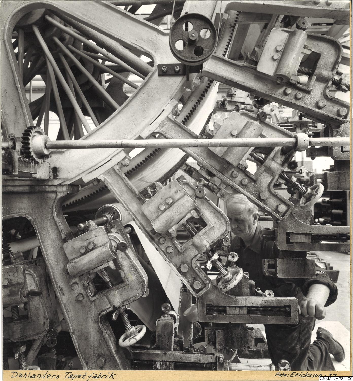 Dahlanders tapetfabrik, mannen jobbar med tapeter och tryckmaskin