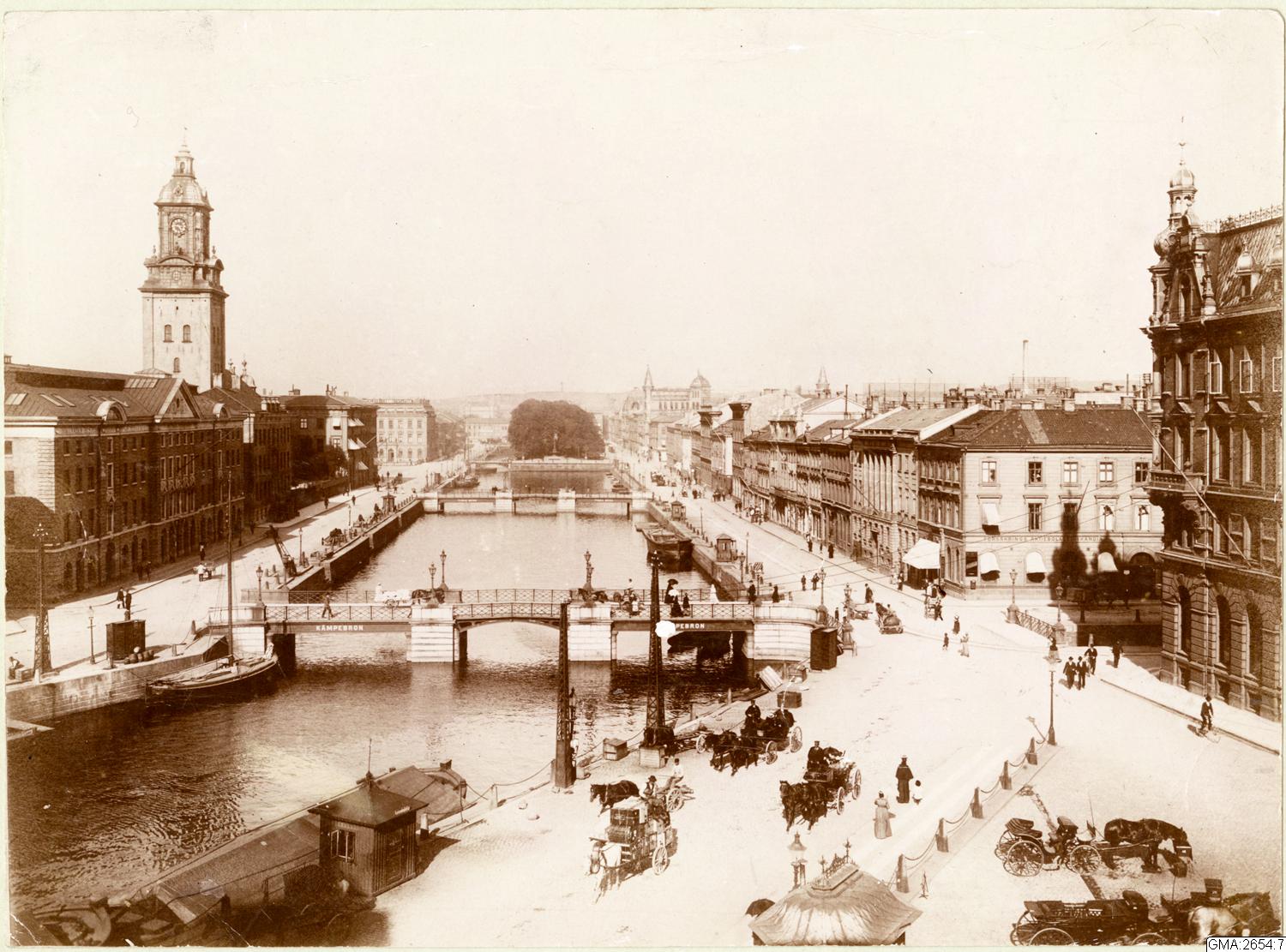 Sträckningsbild över Stora Hamnkanalen, Norra och Södra Hamngatan. Till höger syns Lilla Torget, till vänster i bild Tyska kyrkans torn. I fonden Brunnsparken.