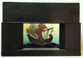 skeppet är limmat mot en liten träkloss som i sin tur limmats på en liten tunn fastspikad träplatta, vågorna limmade på tunna träplattan med utskjutande delar över den runda träskivan (vridscenen) som är placerad i tittskåpsmodellens grundplatta i trä, rundhorisonten är målad på tunn kartong, formad och fäst med häftstift i framkanten mot den kjocka kartongskivan bakom som i sin tur är fastspikad i tittskåpets grundplatta och framsida.