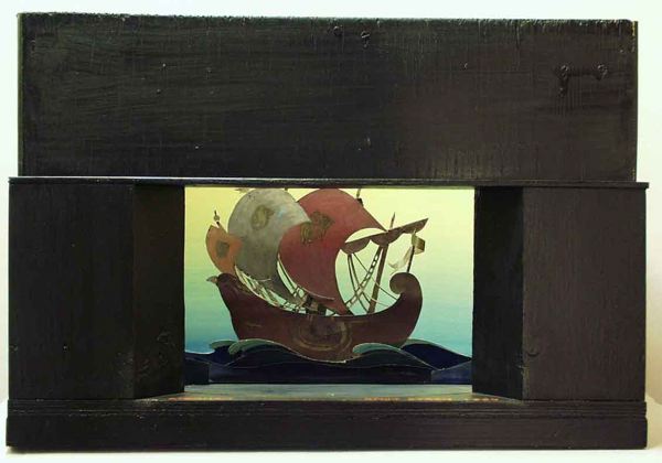 Brunt skepp med fladdrande vimplar och tre hissade segel i rött och grått med vapensköldar, vågor framför och bakom skeppet, blått scengolv, horisonten från blå till gula nyanser. Tittskåpet har svartmålad framsida med proscenium och framscen.