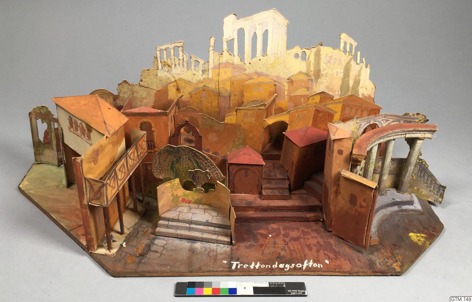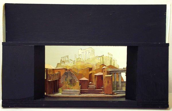 Modellen har en rostbrun grundton med sydländska hus och fasader med pelargångar och balkonger, däremellan prång, trappor och avsatser, en del med valvbågar och portaler, fonden är Akropolisliknande i ljuslila nyanser med fasader och hustak nedanför.