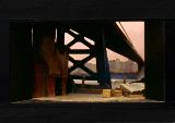 - Scengolvet är målar i gråbruna nyanser, på vänster sida del av en murad fasad med snedtak på höger sida och en port, bakom trappsteg ut till vänster, på höger sida ett lågt skjul med bruna lådor framför, i bakgrunden ett staket (?) med pålar och ett stort, högt svart brofäste med en bro som går snett över hela scenen med brofäste på andra sidan mot den rosa horisonten som har en stads husfasader, höghus, med upplysta fönster o s v.