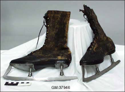 - Skridskor av svart skinn. Hög känga med 12 par hål och 6 hakar. Insida klädd med rött ylletyg. Stålmedar fastskruvade i kängan. Tillverkarstämpel på skenans framkant "R. Schillström & Son".