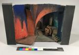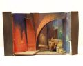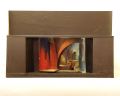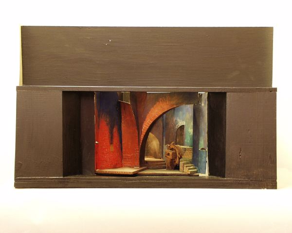 - På vänster sida murad vägg i rött tegel som längst ut till vänster har ett litet fönster, där innanför är väggen rundad och antydan till valvbåge, från det går ytterligare ett valv (halvt) över till scenens högra sida, som har en mörk blågrön vägg med en smal vinklad trappa efter väggen, ett kugghjul står intill trappan, i bakgrunden, i mitten, leder tre trappsteg upp till en avsats som leder vidare in t v, längst ut t h en halvöppen dörr.