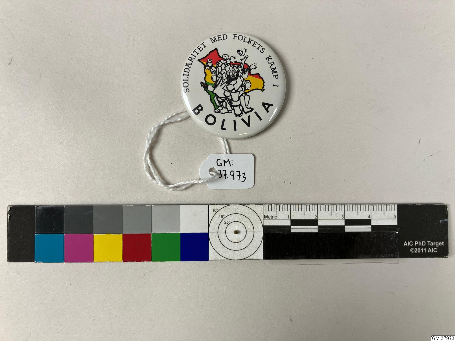 Ett rockmärke vitt med svart text och polykrom bild, "Solidaritet med folkets kamp i BOLIVIA"