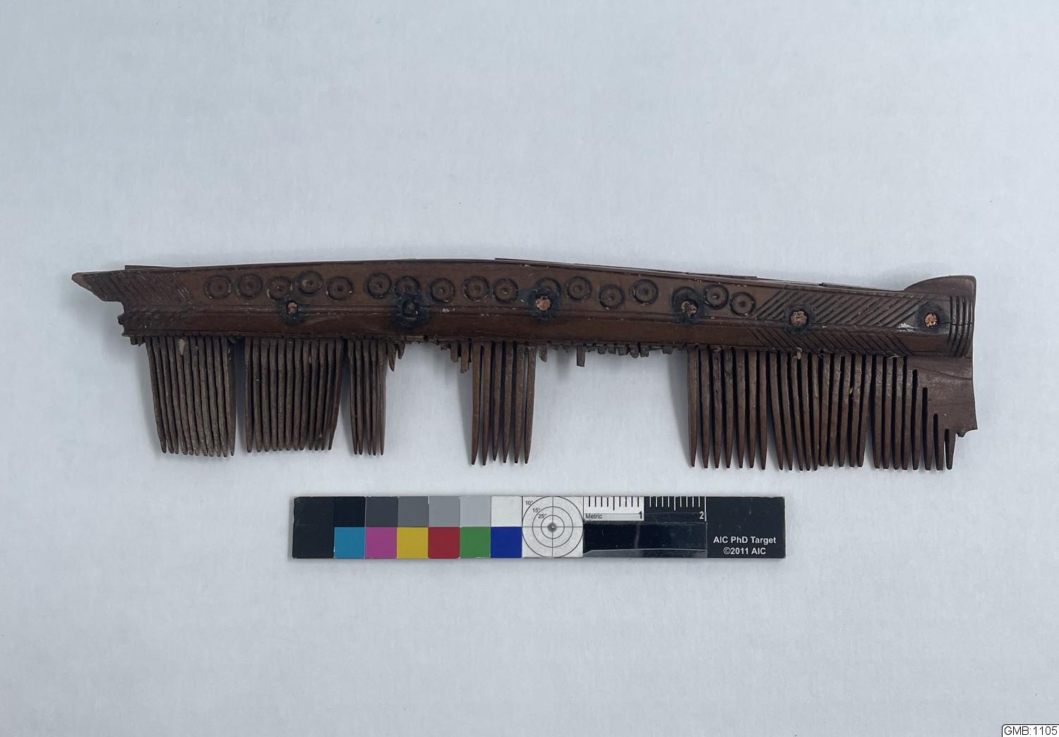 Kam av ben, fragmenterad med längd-, tvär och cirkelsirater ( sirat = Prydd / utsmyckad ) . En del tänder saknas. 14,4 cm lång och 3,5cm bred. Okänd fyndort.