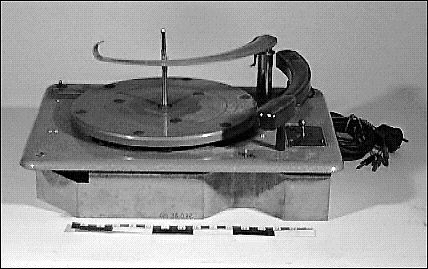 Skivspelare avsedd att anslutas till radio. Hölje i pressad plåt med brunlackerad ovansida och skivtallrik. Pickuparm i brun plast. Automatisk skivväxlare.