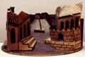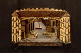 _bild_c: schackmönstrat sluttande golv som går uppmot bakrunden diagonalt med husfasader på båda sidor, längst fram t v en fasad med bågformade fönster, tre trappsteg på längsidan in mot scenen, på höger sida längst fram en mur med en ringmur ovanpå med bågformad öppning till fasaden bakom, som har höga bågformade fönster, alla fasader har fiskfjällsmönstrade tak i tegelfärg, i övrigt är modellen i brunt och guldfärg.