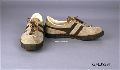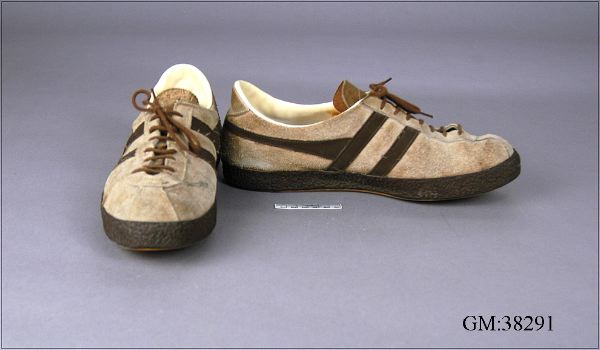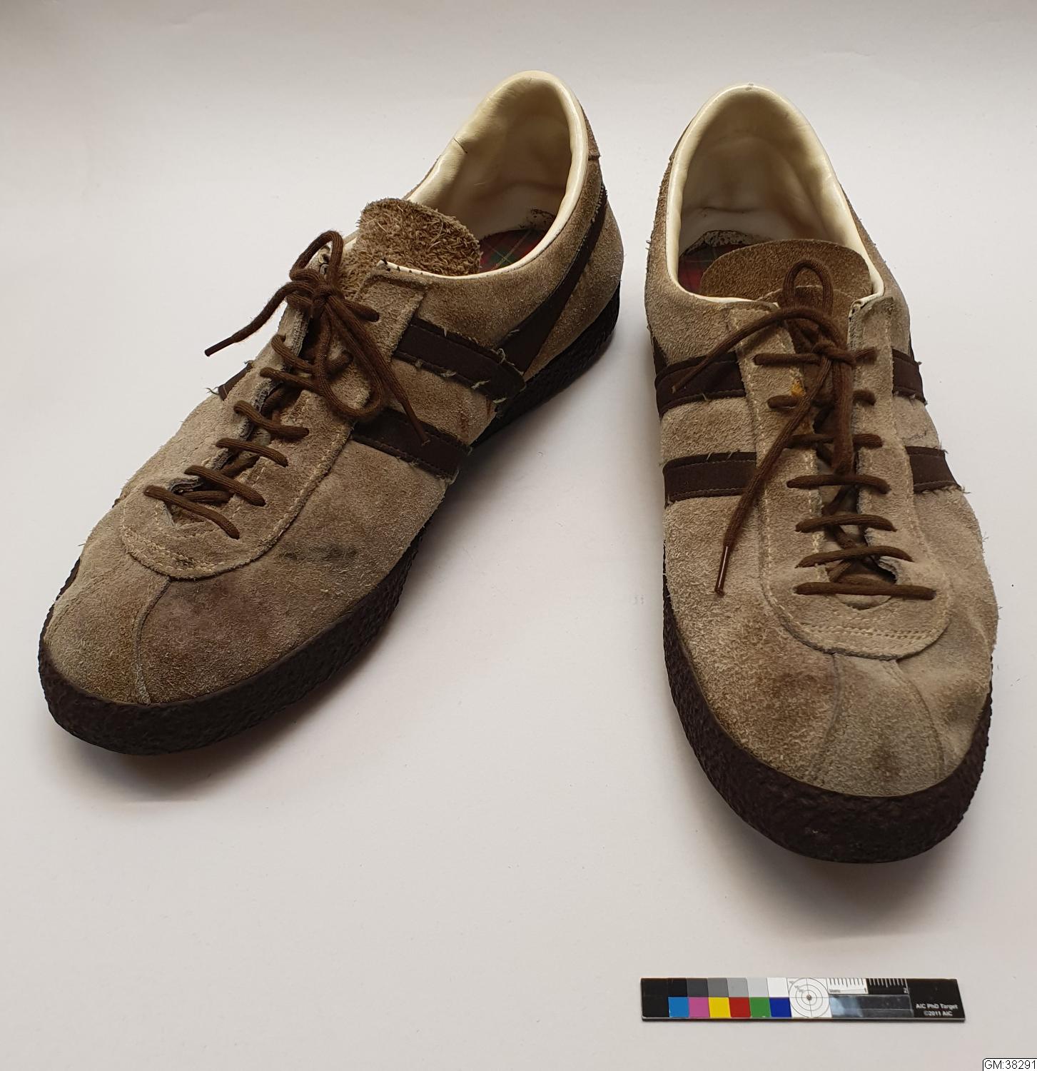 - Fritidsskor eller sportskor i beige mocka med detaljer i mörbrunt skinn. Rågummisula med mörkbrun kant. Snörning med bruna snören och vitt skinnfoder. I skon ligger en skotskrutig innersula i rött som är sekundär.