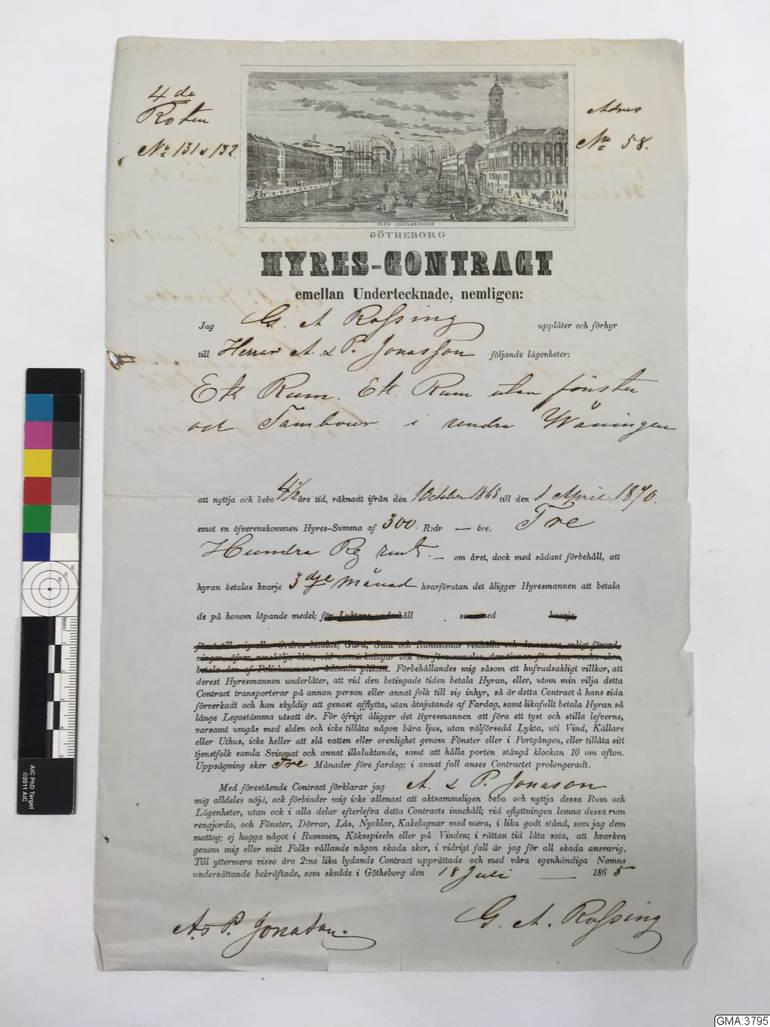 Vignettbild å hyreskontrakt mellan G.A. Rossing (värd) och A.P Jonasson 1865. se vidare GhmE:3272.