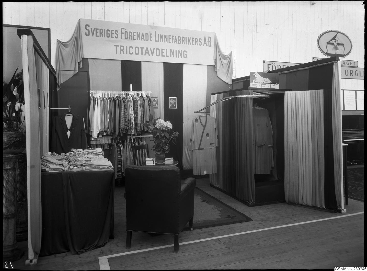 - Utställningsdel på Svenska Mässan. Monter för Sveriges Förenades Linnnefabrikers AB, TRICOTAvdelning