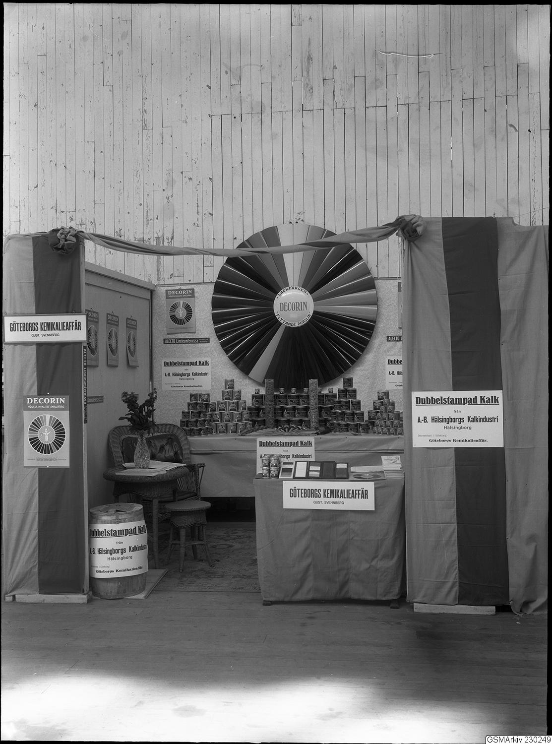 Utställningsdel på Svenska Mässan, Göteborgs Kemikalieaffärs monter, med målarfärg bland annat.