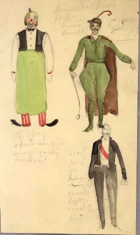 Överst till vänster en man med en lock på den kala hjässan och kindskägg, iklädd vit skjorta, svart fluga, svart uppknäppt väst, röd- och vitrandiga byxor, långt ljusgrönt midjeförkläde, svarta skor. Till höger om honom en man med mustasch, iklädd jockeymössa, grön skjorta och ridbyxor, damasker, brun mantel.