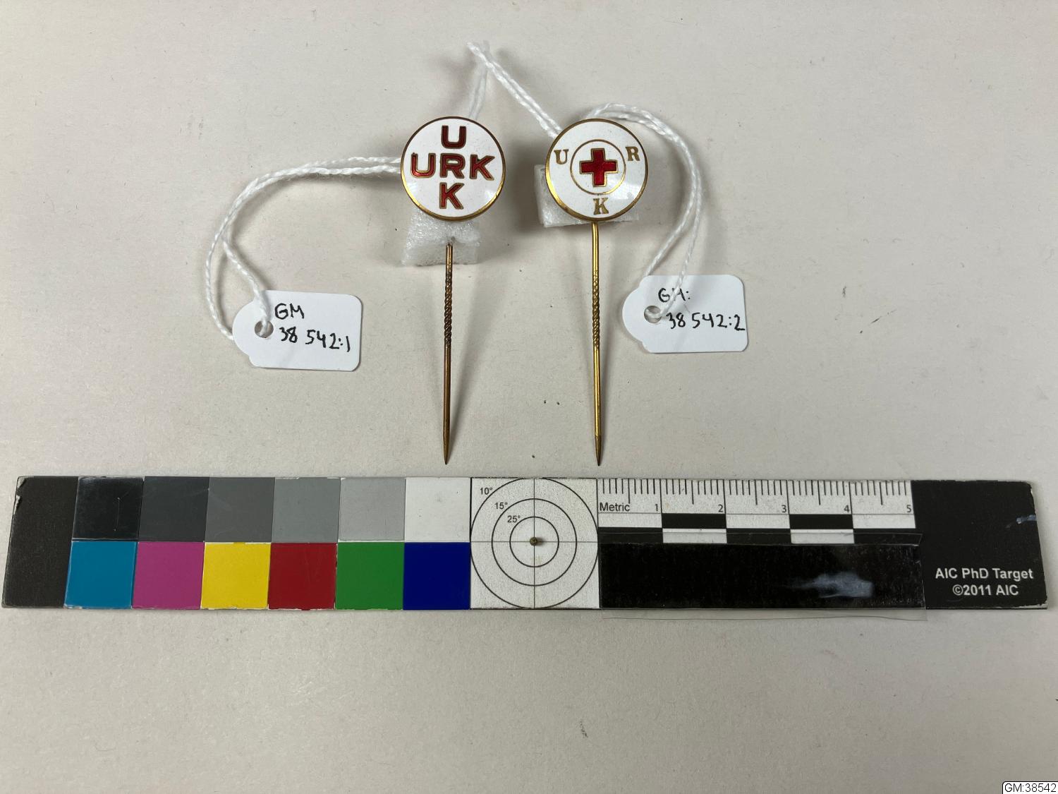 Två små runda rockmärken för ungdomens röda kors. GM38542:1 har bokstäverna URK. den andra emblemet rött kors samt bokstäerna urk.
