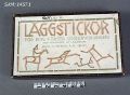 ask med tillhörande läggstickor (röda och gröna i varierande längder). i asken finns även häfte med bildförklaring över hur man kan använda stickorna.