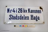Rektangulär vitemaljerad något välvd plåt med emaljerad text i blått inom tunn grå ram: "N:r 4 i 26 kv.Kanonen / Stadsdelen Haga".