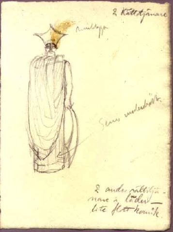 Man med hög flikad huvudbonad, lång tunika, mantel, håller i en bred sabel