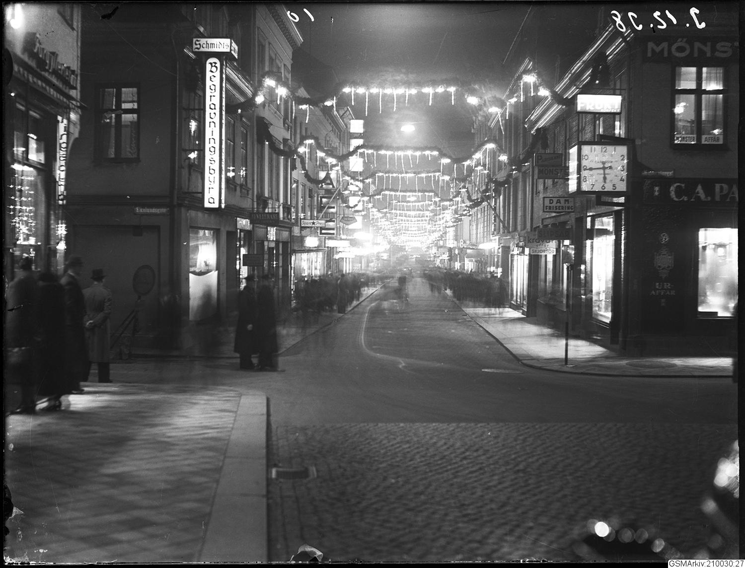 Julskyltning, blick österut längs Kungsgatan, sett från korsningen Ekelundsgatan och Kaserntorget, ; Fotografier och negativ från Kamerareportage bildsamling