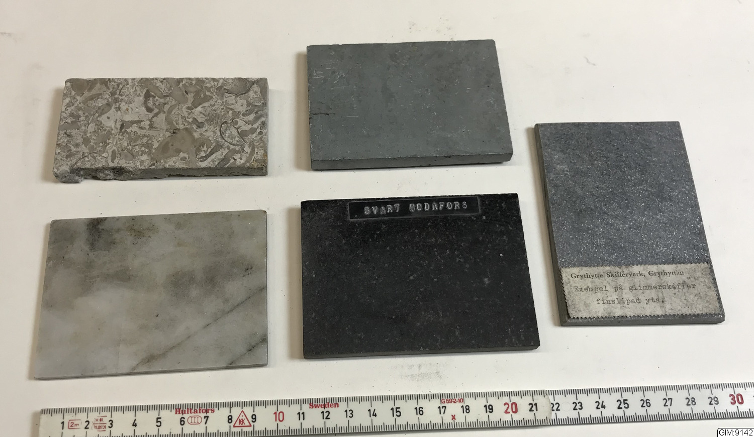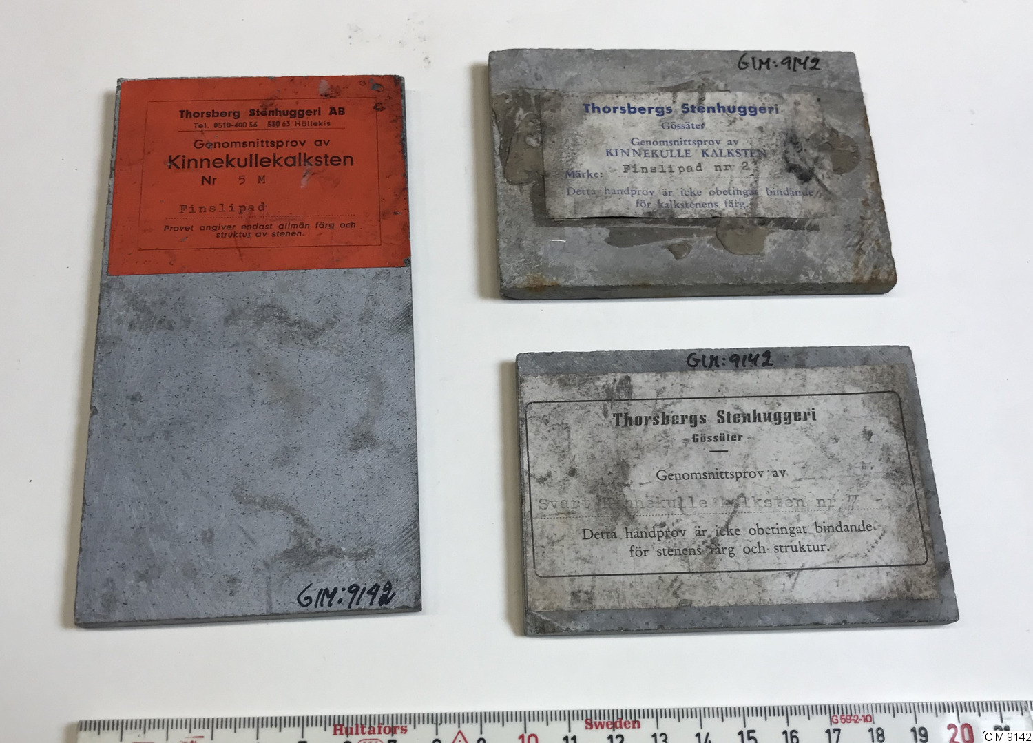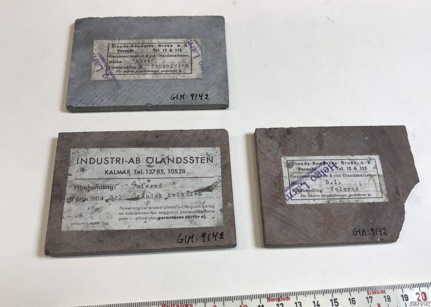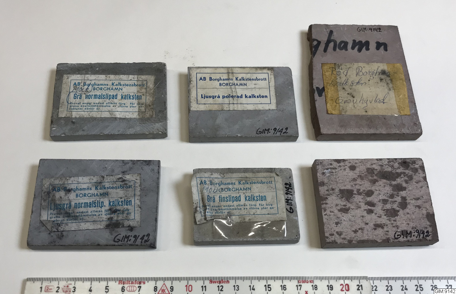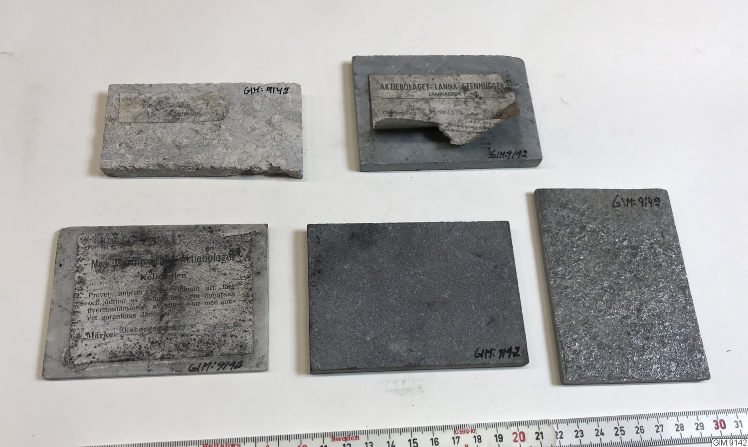55 st stenprover från olika stenhuggerier i Sverige och en plats i Portugal. AB Helgo Lanns Marmorstenhuggeri, Borghamn, Thorsberg, m fl. Flera med fastsatta pappersetiketter.