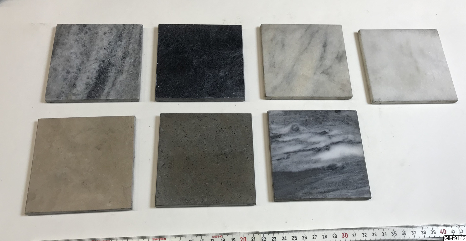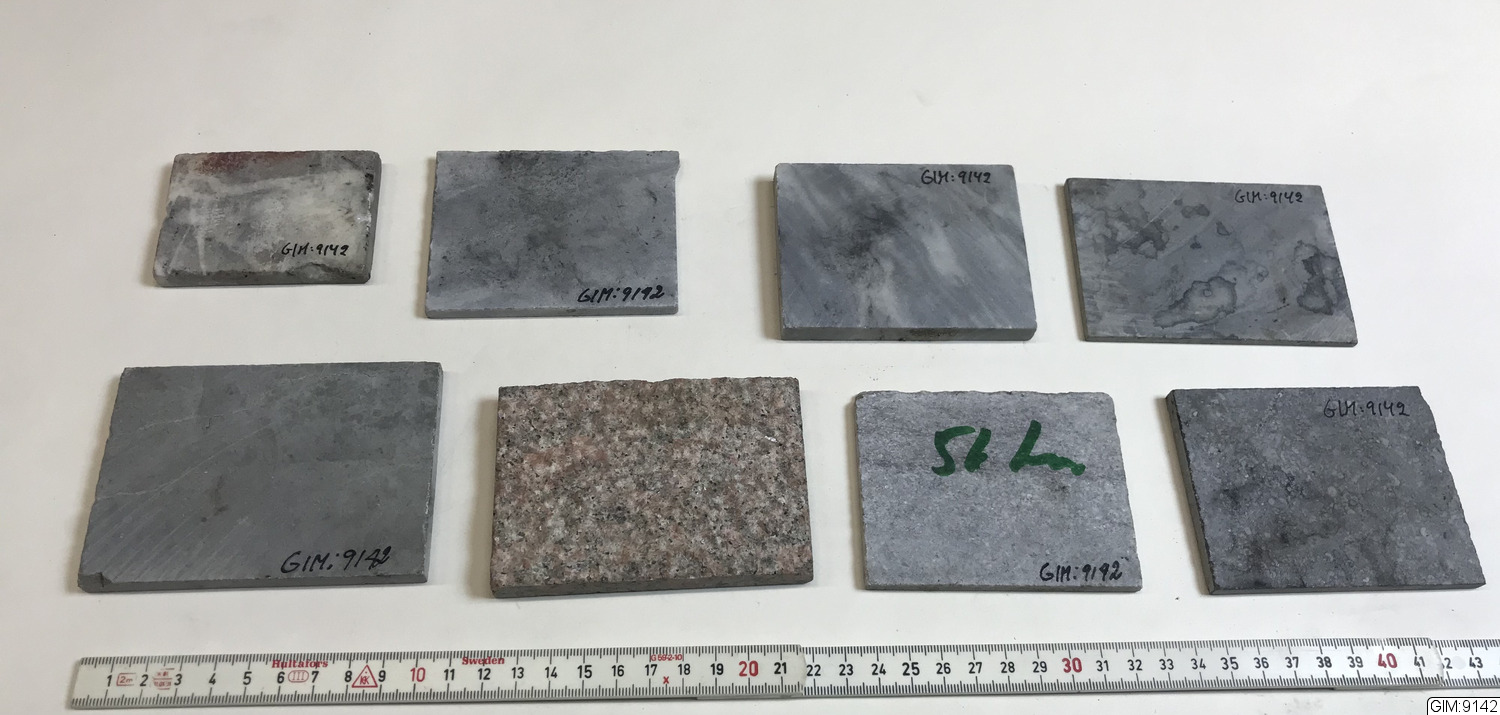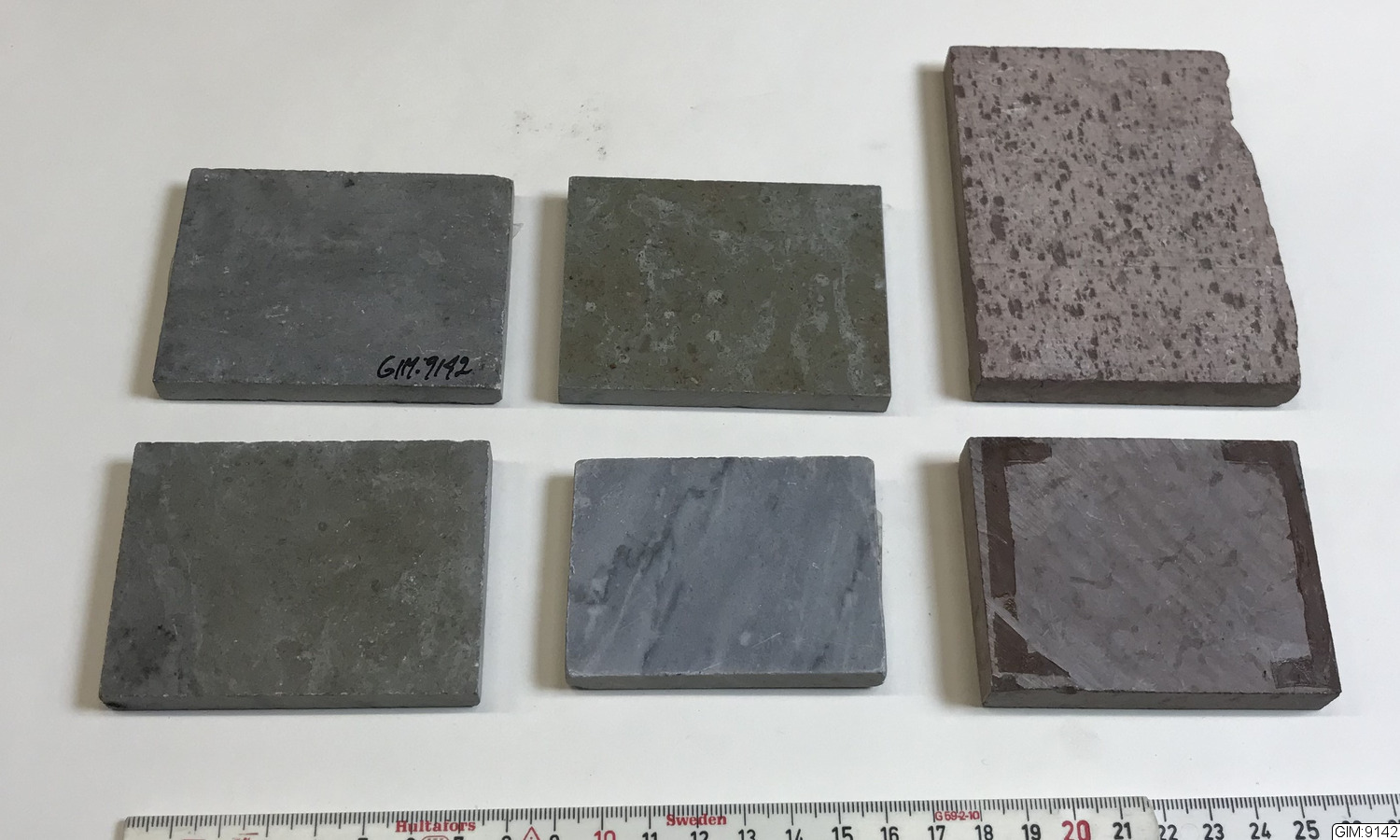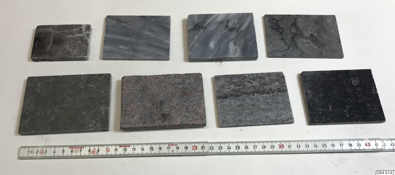 55 st stenprover från olika stenhuggerier i Sverige och en plats i Portugal. AB Helgo Lanns Marmorstenhuggeri, Borghamn, Thorsberg, m fl. Flera med fastsatta pappersetiketter.