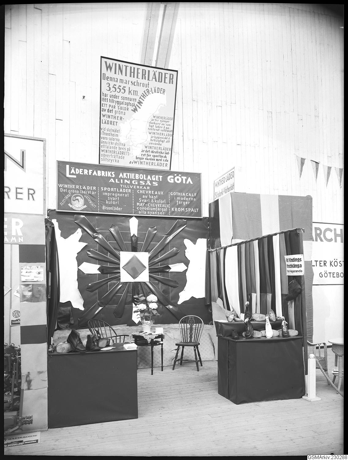 Monter på Svenska Mässan, utställare Läderfabriks Aktiebolaget GÖTA, Alingsås tillverkar Wintherläder, sportläder med mera.